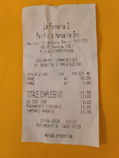Read moreRecensisco per La Forneria 2 sita c/o il mercato orientale. Ieri siamo stati a Genova in giornata e ho avuto modo di acquistare del pesto fresco prodotto da loro. Prodotto eccezionale, fresco, dal sapore di "nonna"! La commessa che ci ha servito è stata di una gentilezza unica.... inizialmente volevamo solo avere informazioni sul pesto e se avesse retto 4 ore di viaggio, poi ci ha chiesto se ci sarebbe piaciuto assaggiarlo e ce ne ha servito un po su due pezzi di focaccia. Papille in visibilio sia per il pesto sia per la focaccia. Alla fine ovviamente abbiamo acquistato il pesto (mangiato oggi ed era delizioso anche con la pasta) e non ci è stato chiesto un extra per i due pezzi di focaccia con pesto. In conclusione, ragazza al banco gentilissima e prodotti ( focaccia e pesto) ottimi. Tornerò presto SICURAMENTE, e con borsa frigo...