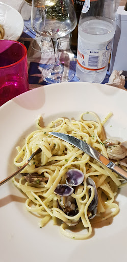 Pronti, partenza via! Antipasti: prendiamo tutti e 6 impepata di cozze, gustose ma come mamma natura le ha fatte, ovvero non pulite...lo riferiamo al cameriere che ci dice che anche altri glielo avevan segnalato, ma " scusateci ma non abbiam avuto tempo di pulirle" Primi :linguine alla sabbia (vongole) e ravioli al branzino insapore in salsa di pomodoro insalata (pomodoro pachino) Anche questa volta lo segnaliamo : " scusate ma il ciliegino lo avevam finito" "dentro ai ravioli c'è la spigola, pan grattato e gambero"... Ora che ci penso il pan grattato si sentiva un sacco! Bella però l'idea del raviolo double face. Secondi: tonno e frittura del pescato Tonno molto buono e ben impiattato, niente da dire. Frittura ben eseguita, peccato per il poco pesce, mancanza sostituita con cipolle in Quantità ( molto buone anch'esse, ma allora cambiate nome al piatto) É arrivato il turno dei dolci! Grasse risate. I dolci non ci sono : "scusate ma sono finiti" Il cameriere propone una soluzione " posso farvi un tiramisù fatto al momento!" Al momento? Le nostre facce perplesse sanno benissimo che il tiramisù ha bisogno di riposare, ma lui ci rassicura "tranquilli due minuti e ve lo porto tanto ho già la crema" e sdrammatizza "l'unica cosa che posso farvi scegliere sono i bicchierini" Grasse risate. Il tiramisù lo prepara il cameriere. La crema era già pronta perché al mascarpone non vengono aggiunte né uova né zucchero, e così, bello naturale viene messo nel bicchierino. A seguire, tocca al savoiardo, che avrebbe voluto tuffarsi nel caffè, ma non se l'è sentita ed é rimasto all'asciutto. Siccome é giusto dare sempre un'altra possibilità, finiamo col caffè. "Scusate ma abbiam finito i cucchiaini, ne ho solo uno, se volete posso vedere ai tavoli se ne é rimasto qualcuno pulito"