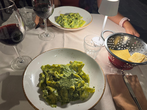 Okay first off, before we could even sit down, there was a problem with the reservation. I called 30 minutes earlier, which btw, took ages to find the actual number, since the number on google maps is INVALID! So you have to visit their website. Now, once we got to the place, it was located in a dark alleyway, which was very scary and once we came in, to check-in, the guy working there said, that there was no reservation for 10 people! I showed him my calls to the restaurant and after around 10 minutes they finally said: “Okay go out front of the church”. Now I understand this, because it was hot out, but damn, in-front of the church? Anyways, the food was very good. The pasta with pesto tasted like heaven. But I can’t say the same for steak. Let’s see the pros and cons of eating the steak: