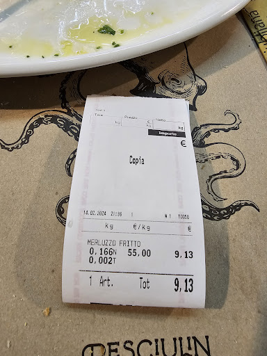 Morale della favola 52€/kg delle seppie alla piastra che costano 14€/kg 50 €/kg del merluzzo alla piastra che ne costa 18€/kg Non c'è altro, ne servizio, ne atmosfera, niente di niente. Se sei pescheria con cucina almeno punta sulla qualità del pesce e sul prezzo, altrimenti se mi chiedi quelle cifre astronomiche io personalmente me ne vado a ristorante dove mi posso sedere comodo a un tavolo , ordinare con calma un piatto, essere servito e riverito dal cameriere e sopratutto il pesce me lo cucinano per davvero.
