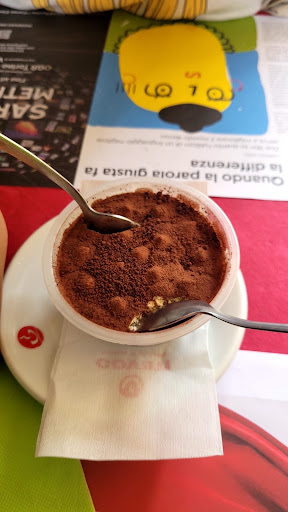 Read moreNous sommes venues à ce restaurant, attirées par les prix peu cher. Toutefois, quelles surprises lorsque nous passons à la caisse et que des frais s’ajoutent !! En effet, nous avons pris deux plats à 6€ et un tiramisu (ci-joint en photo). Nous avons payé 20€ au total, ce qui n’est pas cher je vous l’accorde. Nous avons pris un tiramisu à la suite du conseil de la serveuse qui le trouve, je cite « très bon ». Quel fut notre surprise quand elle nous l’a servi !! Je trouve ça HONTEUX de payer CINQ euros pour un tiramisu que je trouve à Lidl ou Aldi pour 2€ les 4 unités. Nous sommes en Italie et c’est inadmissible que l’on nous serve des tiramisus aussi industriel. Si c’était pour avoir cela, j’aurais pu rester en France. Et aussi il s’agirait de prévenir que 3€/personne s’ajoute pour « frais de couverts ». Bref voilà, restaurant malhonnête et qui ne sait pas accueillir ses clients (car la seule serveuse ne parle pas anglais dans une des rues les plus...