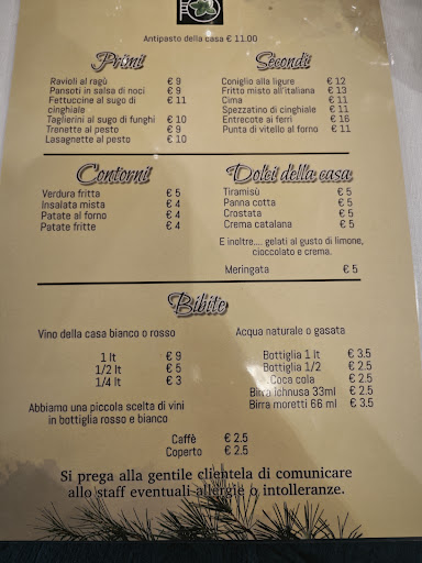 Read moreUn posto assolutamente da evitare, se volete mangiare cucina ligure andate altrove. Appena ci siamo seduti ci é stato servito un cestino di pane scaldato al microonde e gommoso. Poi abbiamo ordinato dei tagliolini ai funghi che erano a dir poco scotti e mal conditi, senza alcun sapore e al tavolo ci é stato portato del formaggio grattugiato di dubbia provenienza servito in una ciotolina come se fosse parmigiano. Per concludere abbiamo chiesto mezzo litro di bianco che abbiamo bevuto perché era decente. Conto da 30€...