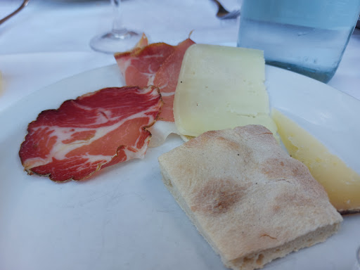 Rifugiatevi altrove! Eravamo in quattro, di sabato sera, sistemati al piano superiore del ristorante, in un’ampia e spoglia sala su tavolini apparecchiati molto semplicemente. Tutto faceva immaginare un’ottima cena (gli amici con cui ero c’erano già stati) che invece si è dimostrata con prodotti non di qualità e con tanti errori nel servizio. L’antipasto? Per € 10 a persona un vassoio con fette sottilissime di lonza, quasi trasparenti di prosciutto crudo, sottilette di formaggio non stagionato, tre micro bruschette (una fetta di pane tagliata in quattro con pomodoro, salsa di rughetta e cavolfiore), un piattino di cicoria ripassata salatissima e la famosa focaccia (torta al testo) giunta fredda (così come quasi tutte le pietanze perché venivano portate da una scalinata esterna e la temperatura fuori era piuttosto bassa). Discrete di cottura ma con sugo un po’ asciutto le pappardelle al cinghiale € 10, immersi in una salsa pannosa/burrosa gli gnocchetti ai porcini € 10, piuttosto dure, sapidissime per l’aggiunta di parecchio sale le bistecche di vitellone € 15 (delle quali tra osso e tanto grasso ne rimaneva ben poco e che il cameriere aveva proposto come vitella), impresentabile il piatto di verdure € 3.50 (ci era stato detto che erano grigliate, poi gratinate e invece sono giunte al forno/in padella): una fetta di melanzana piena d’aglio, un pomodoro da riso diviso in due sapido e una forchettata di peperoni. Nulla di che l’insalata mista € 2,50, nella media il vino della casa all’interno di un boccale sbeccato (€ 6 lt), con acqua (€ 1,50 lt), coca cola piccola (€ 2) e coperto (€ 1.50) abbiamo sfiorato i 40€ a persona. Il prezzo spropositato per la qualità del cibo, per il servizio impreciso, disattento e per la location. Non lo consiglio assolutamente così come non ci torneranno più gli amici che hanno constatato il peggioramento di tutto...