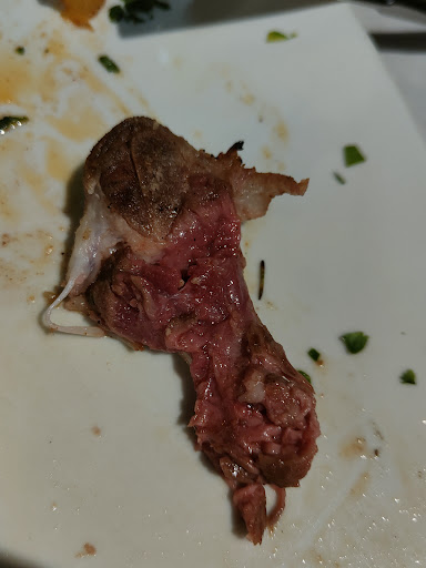 Il terzo pezzo di carne era crudo all'interno (puoi vederlo dalla foto), quindi ho cercato di grattare via almeno un po' di carne dalla ossa con la forchetta. Quando ho finito, ho coperto il piatto con un tovagliolo blu e ho atteso che la cameriera venisse a prendere il piatto. Quando è arrivata al mio tavolo, le ho chiesto quanti pezzi di carne servono di solito in quel piatto. La cameriera ha guardato per un momento il piatto coperto dal tovagliolo e ha riflettuto. Poi è andata a chiedere.