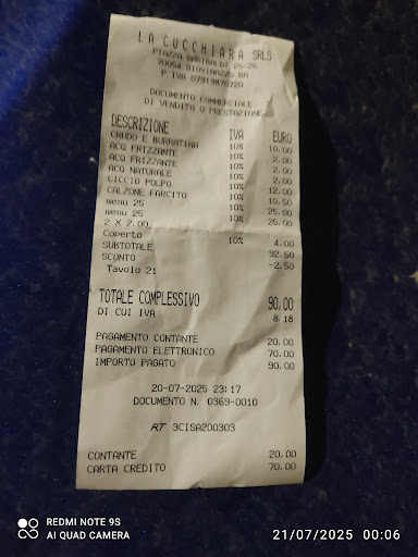 Read moreMi dispiace dover fare una recensione negativa per questo locale, che potrebbe avere delle potenzialità per essere una buona pizzeria. Purtroppo troppe cose hanno fatto sì che io lo valutassi in maniera mediocre. La cucchiara ha una sala piccola e disposta in una veranda semi aperta, fin qui nulla da ridire, visto che la settimana scorsa le temperature erano buone. Tavolata di 13 commensali, ordiniamo tre porzioni di patatine fritte, ne arriva solo una e il cameriere ci toglie i piatti, perché non era un antipasto! Io chiedo di tenere i piatti per le salse e lui per tutta risposta, lascia solo il mio piatto . Aspettiamo un tempo interminabile per le altre patatine e non arrivano, oltretutto nessuno ci viene a chiedere come procede l'attesa. Finalmente riesco a fermare il cameriere ed ordinare altre patatine. Ancora lunga attesa per le pizze. Io avevo chiesto una pizza con funghi, friarielli o cime di rapa e salsiccia di Norcia, senza mozzarella perché fortemente intollerante e al posto di questa dei pomodori infornati. Arriva una pizza meravigliosa, stracarica di condimenti e io sono super soddisfatta, finché non do il primo morso. Subito sento un sapore ed un odore che mi ricorda il formaggio. Chiedo immediatamente al cameriere se c'è del parmigiano, ma dalla cucina dicono che non ce ne sia. Io insospettita scarto tutto il condimento, anche perché la salsiccia di Norcia è mezza cruda. Intanto la mia amica aveva ordinato una pizza con il salmone a crudo e le era arrivata una pizza con salmone cotto e salatissimo. A fine cena ribadisco al cameriere il sospetto del formaggio e lo avviso della pericolosità della salsiccia quasi cruda. Tra una cosa e l'altra, viene fuori che sui pomodori infornati c'era del pecorino 😡. Non sto qui ad elencare i dolori avuti dopo cena! La cosa che mi ha fatto arrabbiare ancora di più è che continuavano a ripetere, che io avrei dovuto mandare indietro la pizza e farmene fare un'altra. Non si sono sentiti per nulla mortificati e preoccuparti per l'accaduto e mi hanno anche fatto pagare la pizza! Infine abbiamo dovuto insistere per avere lo scontrino perché volevamo pagare alla romana, ma non ci hanno fatto nemmeno la distinta. Insomma, per noi questo locale è da cancellare dalla lista delle pizzerie ed è un vero peccato, perché l' impasto della pizza...