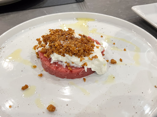 Read moreSe avessi potuto dare più di 5 stelle le avrei date. È assurdo come questo locale possa rispecchiare in toto i miei gusti. Lo stile industrial usato per l'arredamento mi fa impazzire. Sala grande, tranquilla e favolosa con quadri maestosi, bancone per l'area bar, frigoriferi per esporre le carni pregiate, aria condizionata, tavoli ampi e pulizia estrema. A servirci è stato Nicola. Davvero impeccabile. Gentile, simpaticissimo, attento a ogni dettaglio, chiaro e disponibile nelle spiegazioni delle portate e consigli vari per farci godere al meglio l'esperienza. Perché sì..una cena da I Bacco è un'assoluta esperienza da vivere. Non solo per l'atmosfera descritta fino ad ora, ma ovviamente anche per il cibo impeccabile e di altissima qualità. È stato un viaggio incredibile ogni cosa che abbiamo ordinato. Una goduria estrema a ogni boccone. Attraverso i piatti, ci siamo accorti di quanto impegno, studio e amore c'è dietro questa attività. Ne vale la pena ogni centesimo speso. Io e il mio compagno ringraziamo di cuore per il vostro lavoro e per averci accolto nel modo migliore possibile. Noi torneremo sicuramente ma a voi che leggete le recensioni, consigliamo vivamente questo locale che è una vera chicca...