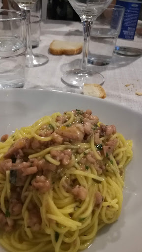 Il servizio è stato lento: non che avessimo ordinato molte portate, ma l’intero pranzo è durato due ore e mezza. Comprensibile in parte, visto che la sala era gestita solo da due persone, ma per chi – da turista – sperava di godersi anche il pomeriggio al mare, è risultato eccessivo. Altro punto critico: l’assenza di menù, né per cibo né per vini. Ci siamo dovuti affidare a ciò che arrivava, senza possibilità di scelta. L’antipasto, unico e non annunciato, era un piatto misto con piccoli assaggi:soutè di vongole, cozze, scampetti al pomodoro, farro con gamberetti, pesciolini fritti e un cannolicchio gratinato. Tutto buono, stile tapas, ma avrei gradito saperlo prima, magari per optare per un crudo. Sui primi, le chitarrine alle vongole sono state eccellenti; le mie orecchiette con cime di rapa e gamberetti più sbilanciate sulla verdura, son si sentiva il profumo del mare. Molto buono il sorbetto al limone con frutta sciroppata fatta in casa, fresco e curato.