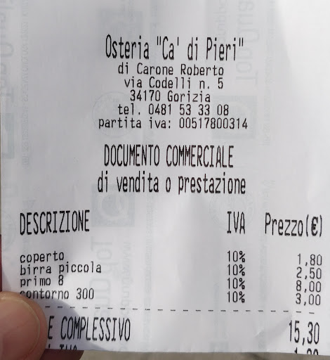 Sono arrivata a Gorizia e nella ricerca di un Osteria mi sono imbattuta in un Osteria "Ca' di Pieri" al di fuori e molto caratteristica si vede che è storica ma ristrutturata, di Gorizia nell' entrare dentro e come fare un tufo del passato infatti chiedendo informazioni di questo posto e aperto da più di 60 anni molto accogliente e dallo stile caldo cameriera molto accogliente e con il sorriso ha elencato in una maniera straordinaria il menù del giorno prendendo guancialetto di maiale e polenta con cicoria che dire della cucina guancialetto di maiale tenerissimo e saporito polenta la classica della Valsugana e cicoria che no sembrava di mangiare cicoria che di solito risulta amara ma questa era cotta con amore per finire il mio pranzo caffè nell'Osteria "Ca' di Pieri" si sta bene e prezzi abbordabili mi sono sentita a casa la consiglio vivamente e un posto di cui ci ritornerò molto volentieri i proprietari fanno questo lavoro con passione e devozione che di dire Consigliatissimo 👏👏👏...