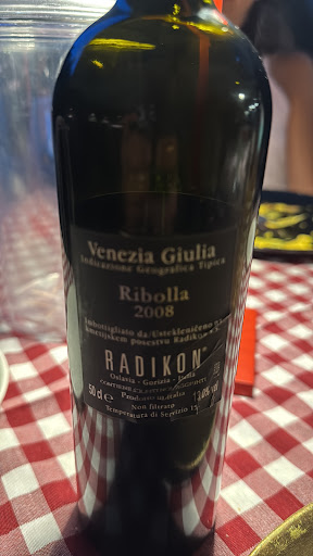 Serata sfortuna per la cameriera e un po’ anche per noi. Premetto che ho scelto il ristorante grazie a Raisin, app di vini naturali dove é consigliato. Chiedo un vino naturale e mi risponde che il fornitore non ha consegnato e mi propone dei biologici… boh, ho detto avrò sbagliato ristorante. Avendo visto delle foto ed essendo in casa Radikon provo a chiedere ribolla gialla, la cameriera mi dice si sì quello da 33cl. O mamma mia, speriamo capisca e mi porti il vino giusto. Arriva Radikon a temperatura cantina, 2008! Una chicca. Chiediamo un menu senza pesce mi risponde che abbiamo sbagliato ristorante, io le dico che avevo chiamato avvisando ed in qualche modo si sarebbe fatto, infatti ordiniamo un prosciutto crudo veramente buono accompagnato con una giardiniera su letto di tonnata. Tonnata? Si appunto, ci deve essere stato un errore, mia figlia é allergica, chiedo conferma alla cameriera e mi dice che è maionese non tonnata. Con un certo sguardo che lasciava trapelare il suo disappunto. Vabbè mia figlia insiste e mi dice che era tonnata, allora la assaggio, é tonnata! Mi alzo la porto in cucina e segnalo l’errore, mia figlia é allergica, va in ospedale se mangia pesce….. dopo poco arriva una nuova giardiniera su letto di maionese, chiedono scusa ma segnalo che non è questione di scuse, qui si va all’ospedale….. vabbè, mi bevo un bicchiere di Radikon e non ci penso più….. tornando ai vini naturali, i miei vicini di tavolo sono la famiglia Radikon e Paraschos, due eccellenze.