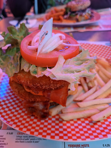 Esperienza pessima... ordino delle alette di pollo che mi arrivano carbonizzate al tavolo, la cameriera me le mette li e mi fissa quasi come a dire te le porto via? Io non ho detto niente perché ero con una ragazza e non volevo creare problemi e imbarazzo a lei ma immaginate quanto può essere umiliante farsi servire un piatto bruciato al tavolo (tra l altro 7 euro per 8 alette di pollo) poi chiedo un panino, ce ne sono da 3 dimensioni, chiedo alla cameriera più o meno quanto sono grandi questi hamburger? Mi fa segno con le mani facendo coincidere l indice destro con l indice sinistro e il pollice destro con il pollice sinistro e dice "piccolo e così " poi distanzia tutte le dita di mezzo centimetro e sempre formando un cerchio con le mani dice "medio e cosi" e distanziando ancora le mani di un altro mezzo centimetro "grande e cosi" ... boh decido per il medio... Non avevo molta fame ma piccolo , da quello che mi aveva indicata, era come un hamburger del mc Donald... Be decido quindi per il medio (che costava più del piccolo ovviamente) e mi arriva un panino che non riuscivo a tenere con due mani... una roba enorme almeno il doppio di quanto mi aveva indicato la cameriera... Non sarebbe stato un grosso problema se nn fosse arrivato... FREDDO completamente FREDDO !!! Morale della favola, ho speso solo io 28 euro per mangiare 8 alette carbonizzate quindi cancerogene e un hamburger FREDDO E UNA chees cake (che era l unica cosa soddisfacente) ! Non mi vedranno mai più se non per mangiare un dolce....
