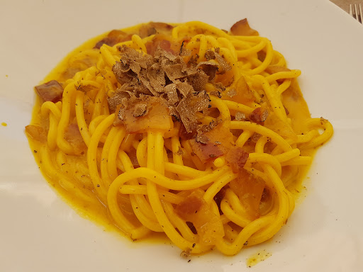 Lo spaghettome alla carbonara, dall'impatto visivo promettente, viene sopraffatto da un tartufo un poco invadente e da una cottura parsa eccessiva. I cappellacci al formaggio di fossa e salsiccia su letto di zafferano sono parsi più godibili, se pur al di sotto dell'invitante impiattamento.