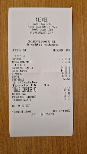 A Lè cube...il "ristorante del sole" A Grado, conosciuta anche come " l'isola del sole", abbiamo trovato "il ristorante del sole": A lè cube. Il fatto che sia situato in una via principale, ha aggiunto un tocco speciale all'atmosfera, perché pranzando all'aperto ti senti immerso completamente nell'energia e nel cuore pulsante della città. Questo ristorante ha portato un po' di calore argentino nei nostri cuori. Fin dal momento in cui siamo entrati, siamo stati accolti con sorrisi e calorosa ospitalità da tutti. Ma parliamo di cibo: i piatti di pesce serviti ( un fritto misto e una cassouela di mare) erano semplicemente straordinari! Freschi, gustosi e preparati con maestria. Porzioni abbondanti e presentazione curata nei dettagli. Per non parlare della crema catalana...un'esplosione di gusto. Non posso che elogiare la gentilezza e la professionalità dello staff, che ha accolto ogni richiesta con cortesia e prontezza. In definitiva, consiglio vivamente questo ristorante a chiunque si trovi a Grado e desideri assaporare non solo ottimo cibo di mare, ma anche un'atmosfera accogliente e solare. Grazie di cuore ai titolari, persone splendide, per aver reso il nostro pranzo così piacevole e gustoso. Al prossimo passaggio proveremo i piatti di carne e perché...