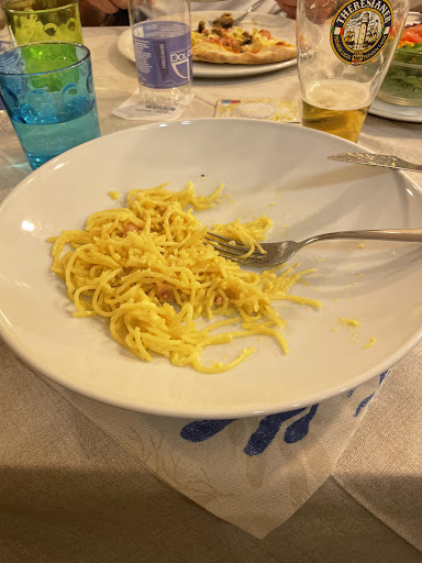 Read moreThis review is for restaurant menu, not about pizza. Lights are bright and service is fast, sometimes a bit too fast. Plates disappear if you don't guard them. Well, my plate was empty, but I was planning to scrape the remains of the sauce. Low marks come mainly from scallops, which were a boarderline quality with one of the three actually tasting bad. They were on a daily special menu, so no excuse. We both had carbonara with smoked swordfish. Mine was good but the second portion was on the dry side. As mine was a starter and my wife's the main course - both were served at the right time - maybe they were made at the same time and the second one kept warm waiting. Sardines with patter were filleted and easy to eat. In normal Italian style, there was sardines, a lemon and three leaves of rocket on the plate. You have to order contorni as a side dish if you want vegetabkes. House white...