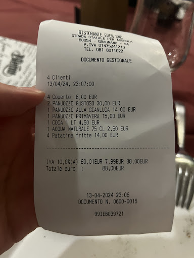 Read moreQuattro persone abbiamo mangiato una porzione di frittura euro 20,00,una bottiglia di acqua euro 2,50 ,due birre Ceres 33cl euro 8,00, due panuozzi euro 30,00, una tagliata di carne con porcini euro 20,00, quattro coperti per una modica cifra di euro 88,50 .Con questa cifra avremmo fatto un pranzo completo. Per quanto riguarda la frittura era tutto congelato, invece per la carne prezzo esagerato,i panuozzi non erano il top , inferiore ai panuozzi di Gragnano con un costo superiore.Sconsiglio a tutti di fermarsi ma proseguire...
