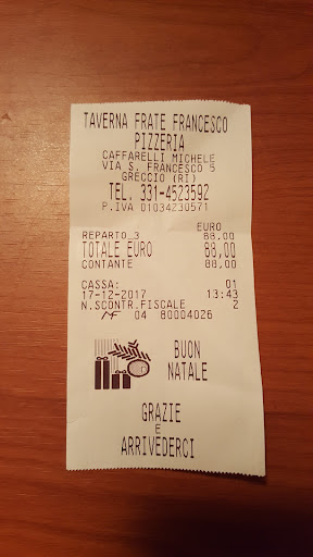 Greccio non è ciò che sembra, si visita al massimo tutto in un paio di ore (e sto esagerando), i mercatini sono 15 bancarelle, una chiesa, 5 vie, 1 stanza con 10 quadri, un locale con 20 presepi chiamato museo e il santuario. Quindi programmate la gita di mattina o pomeriggio,ma per mangiare tornate giù verso Rieti o Terni in pochi minuti...già lungo la strada troverete tante Trattorie, Ristoranti, Pizzerie tipiche con ottimo cibo e prezzi onesti. A Greccio ci sono 4 ristoranti più o meno piccoli che agiscono tutti come un cartello ben delineato, statene alla larga. Amo mangiare bene e spendere, ma qui e in particolare alla TAVERNA FRATE FRANCESCO si viene rapinati. RISPONDO AL SIG. CAFFARELLI (vedo inoltre che la prima recensione positiva porta lo stesso cognome): Dichiara che forse eravamo in 4 e poi che la pasta del bambino non è stata fatta pagare, se non ricorda come fa a dichiarare questo? Comunque eravamo 2 adulti e un bambino, all'atto del pagamento con carta le ho anche chiesto...ma per noi 3 questo importo? Complimenti quindi, se la pasta a suo dire fosse stata offerta, si è intascato 44...