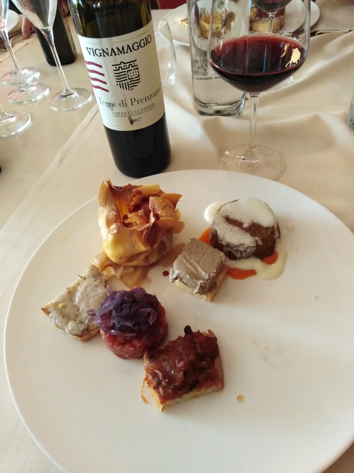 Sono stato qui con amici oggi, 18 ottobre 2020, eravamo in 10, e all'ultimo momento si è aggiunta un'altra persona, ma il personale non ha avuto alcun problema a riguardo. Abbiamo scelto un menù a prezzo fisso, composto di antipasti come da foto, bisteccona da 400 grammi con contorno di patate (una commensale ha preferito un'insalata ed è stata prontamente accontentata), una bottiglia di ottimo vino ogni tot. persone (non ricordo quante, ma abbiamo bevuto tutti molto), completo di bibite e caffè; al di fuori del menù abbiamo preso un dolce. Partiamo dalla locazione del locale, nella splendida Greve in Chianti, cittadina-bomboniere con una splendida e vasta piazza dove abbiamo passeggiato post pranzo; al suo interno il ristorante ha un'ambiente caldo e accogliente, in particolare io e tre amici, arrivati per primi, abbiamo ricevuto un cocktail di benvenuto nell'attesa degli altri amici. Il personale è gentile e attento a ogni richiesta, ma le 5 meritatissime stelle sono dovute al cibo, che ha fatto si che più che a tavola ci si sentisse in paradiso: ogni pezzo di antipasto mi obbligava a chiudere gli occhi per concentrarmi totalmente sul suo sapore unico e gustosissimo; sicuramente si può parlare di cucina gourmet per la raffinatezza con cui erano eseguiti i piatti e per le ricette ricche di sfumature di ogni ingrediente. Successivamente ci è arrivata la carne, come da video, la classica bistecca fiorentina, cucinata al sangue, ricca di sapore, la mia bocca sprigionava acquolina ad ogni morso; il tutto è stato accompagnato da ottimo vino, "facile da bere", e anche molto piacevole!! Infine abbiamo scelto, fuori menù a prezzo fisso, di prendere anche degli amari e dei dolci, scelta rivelatasi ottima, non ci saremmo persi, altrimenti, dei piatti, ma delle emozioni. Da sottolineare che ci è stata portata anche più carne di quanto previsto, sicuramente...