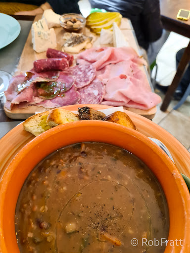 Open later in the day next to the castle which was a big positive. Staff spoke English, knew their stuff and friendly. Great wines served at small portions for the cost. Excellent mixed antipasto plate, which was good value at 35 euros featuring local specialties. However, the main meals were average, small portions of meals that appeared to be reheated - e.g., riso croccante and a piece of cannelloni ragù for 12 and 15 euros respectively. The veal was enjoyable. Expensive cover charge at 2.5 euros per person with only one serve of bread at the table, and water at 2.5 euros per serve. Enjoyable enough but expensive overall, particularly given that you can visit Michelin bib gourmand restaurants or similar for much less...