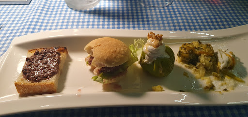 Es gibt Menu fisso (25€) und alla carte. Eigentlich ging es sehr gut los: herzliche Begrüßung durch Giacomo und das Antipasto war auf Gourmet Level. Danach kam leider nichts mehr dergleichen: die Bici waren verkocht und zu heiss (vermutlich Mikrowelle aufgewärmt), die Sauce vom Geschmack unter dem Standard auch wenn es angeblich mal Chianina Rind war. Secondo ist in Italien immer etwas kritisch: das Pollo (Schlegel also günstigster Teil des Hähnchens) mit Pistazienmantel eine gute Idee, aber halt aus der Friteuse. Dazu ein "fileto di maiale", welches extrem zäh war und eher an ein normales "arrosto" (Schweinsbraten) erinnerte als an Filet. Als Beilage klein geschnittene Kartoffeln, die so hart aussen waren, dass man denken könnte, sie waren bereits das zweite mal im Fett? Dolce zur Auswahl Kuchen oder Cantucci vinsanto.