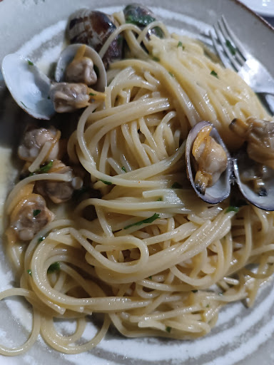 The handmade noodles were a culinary delight, and the local clams were a highlight with their incredible taste. On the downside, the pizza was a tad dry and slightly overcooked. The ambiance of the place was charming and a local favorite. Despite a minor language barrier, the service was still quite pleasant, and it's worth mentioning that the reasonable price added to the overall satisfaction given the...