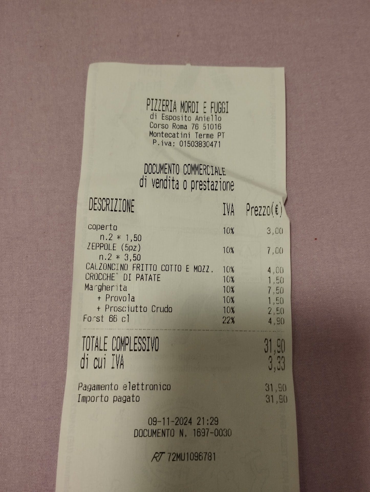 Sono anni che vado in questa pizzeria, dove ho quasi sempre trovato una pizza napoletana molto buona. Purtroppo, nell' ultimo periodo, la qualità della pizza e il servizio sono peggiorati notevolmente, tanto da arrivare a sabato sera dove si è raggiunto il minimo storico. Attesa di circa 45 minuti per avere una pizza, visto che agevolavano quella da asporto e dei raider, la pizza infine arriva bruciata. Dopo aver fatto notare al pizzaiolo che la pizza era troppo cotta (bruciata), ottengo la sostituzione con una nuova che arriva quasi cruda. A questo punto, molto amareggiato e per non rovinare la serata, non faccio polemiche e consumo solo la parte centrale, che tra l' altro non è all' altezza delle solite volte (pasta sottile, cornicione immangiabile...). Concludo con la sorpresa finale: Il Conto. Prezzi esagerati, per l'aggiunta di prosciutto e variazione di provola al posto della mozzarella, noto la differenza di 4€ sul prezzo già alto di 7,50€ sulla pizza Margherita. Inoltre pago 7€ su una porzione di zeppole fritte che mi viene aumentata a 2 porzioni, nonostante ne avessi consumata una sola. Infine una birra in bottiglia al modico prezzo di 4,50€. Mi dispiace, ma a malincuore, non metterò più piede in questa pizzeria che ha perso quelli che sono i veri valori di una buona e sana...