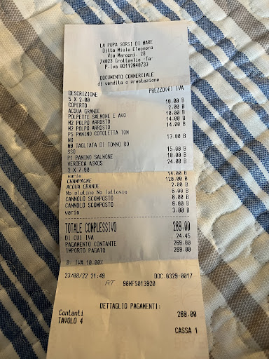 Attirata dalle numerose recensioni positive ho deciso di prenotare un tavolo per oggi a pranzo. Parto col dire che il servizio è stato pessimo, dall'inizio fino alla fine. Dal momento in cui ci siamo seduti, abbiamo aspettato un quarto d'ora/venti minuti per ordinare (ho dovuto chiamare io la cameriera, altrimenti chissà quanto ancora dovevamo aspettare). Arrivati alle 14, ordiniamo un crudo di mare (pagato la bellezza di 50 e passa euro per pochissimi pezzi, lascio giudicare a voi dalle foto) che ci arriva intorno alle 15:05. Alle 15:40 ci arriva un primo e il tagliere che aveva ordinato il mio fidanzato. Tagliere in cui (da menù) dovevano esserci salumi, formaggi e delle cialde di pane fritto. Quest'ultimo assolutamente non pervenuto. Lo facciamo presente in cassa, il proprietario con la sua bella faccia ci risponde, ridendo di buon gusto, che le cialde di pane erano finite e dunque non ce le avevano potute servire. Purtroppo e dico purtroppo si è trovato di fronte due ragazzi molto educati che pur di non alzare la voce e fare un casino della madonna hanno preferito rimanere nell'educato, pagare e andare via. Ma qua te lo voglio proprio scrivere. Mi auguro vivamente che tu non abbia mai più una reazione del genere di fronte a nessun cliente, perché ricordati che alla fine dei conti sono loro che ti portano il lavoro e non il contrario. Ridere di fronte a una tua mancanza, ma stai scherzando? Con quale criterio fai questo lavoro? E puoi offrirmi tutti i caffè e gli amari che ti pare...resta il fatto che se hai rispetto della persona che viene a mangiare da te , se manca qualcosa, vai al tavolo, ti scusi e offri qualcos' altro dal menù. Punto. Se non siete in grado lasciate perdere , perché sennò passate per ladri. Tendo a sottolineare che il 98% del menù di pesce è surgelato. E anche qua mi fermo perché potrei andare oltre i limiti...