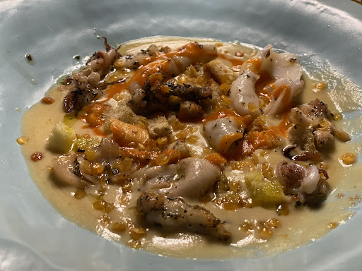 Read moreSerata nella bellissima e suggestiva Grottammare Alta dove ero andato principalmente per visitare la bellissima Mostra Fotografica “Grottammare e i suoi colori” del bravissimo fotografo locale Aldo Pelosi, allestita sapientemente sotto il loggiato panoramico di Piazza Peretti. Conoscevo l’osteria dell’Arancio ma non avevo mai avuto il piacere di assaporare i loro piatti. Non avrei sperato di farlo proprio nella stessa sera in quanto la stupenda piazza era gremita di tavoli che erano al completo. Nonostante ciò dopo qualche attimo di titubanza chiediamo se c’era posto per due persone, e in maniera estremamente gentile il personale ci trova un tavolo che ci sistemano in un batter d’occhio, ci vengono portati i menu, intanto mentre diamo un’occhiata, arriva del pane posizionato su un cartoccio e dell’acqua minerale fresca in bottiglia personalizzata “Osteria dell’Arancio” molto carina. Leggendo il menu ci viene voglia di un antipasto di mare caldo, crema di ceci calamari scottati, crostini di pane e lenticchia soffiata, che ci facciamo dividere per degustarlo in due, strabiliante è dire poco, veniamo poi ai primi piatti dove scegliamo dei Boccolotti Baldoni (un ottimo Pastificio locale) alla carbonara di mare e guanciale croccante oserei dire sublimi e una Tagliatellina artigianale all’ortica, basilico e spinaci, al ragù bianco e Varnelli veramente speciale. Due calici di vino uno bianco e uno rosso consigliati dal personale veramente di qualità, le bottiglie sono state aperte sotto i nostri occhi. Che dire servizio impeccabile, tutti estremante gentili a partire dai camerieri fino al titolare del locale. Il conto veramente una sorpresa considerando la location meravigliosa, la qualità dei prodotti offerti e il servizi, è stato buonissimo, oltre ad averci fatto un po’ di sconto sul totale. Torneremo sicuramente a degustare gli altri piatti..complimenti a tutto lo...
