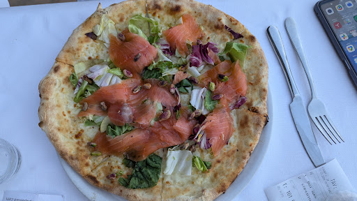 Read moreL'ambiente è super, niente da dire per la vista mozzafiato in un terrazzino dove abbiamo cenato io e mia moglie in compagnia di un paio di fastidiose api che ci ronzavano attorno. Abbiamo mangiato come antipasto delle patatine fritte che sarebbero state eccezionali se servite almeno tiepide. Abbiamo continuato con crostini con salsiccia e pecorino e crostini con funghi, crudo e formaggio: molto buoni devi dire. Mentre stavo finendo il mio crostino, è arrivata la pizza alla parmigiana che avevo ordinato con gli antipasti e, pur avendo ancora un boccone da finire, la cameriera stava pensando dove lasciare la pizza. Le ho evitato l'imbarazzo addentando l'ultimo pezzo di crostino e sparecchiando in fretta e lasciando libero il posto per la pizza. Mia moglie ha preso una pizza bianca con salmone e burrata (che però ha chiesto di togliere perché non gli andava). Le pizze erano buone, l'impasto normale abbastanza croccante. Bevuto uno spritz, vino bianco spumantizzato e una bottiglia di acqua frizzante. Chiuso con due decaffeinati. Oltre a non aver mai ricevuto la richiesta se tutto fosse andato bene, abbiamo pagato 71€ in due (pizza di mia moglie senza burrata a prezzo pieno, coperto 2,50 CAD e spritz 7,50€). Personale poco cordiale per il posto che vuole essere elegante e che già alle 20.30 arrancava battendo i piedi in maniera pesante sui gradini per raggiungere le varie terrazze. Si trova di meglio nel borgo, dove si è serviti in maniera migliore e si è contenti di pagare un qualcosa che generalmente non è mai scritto nel menù: la cortesia e...