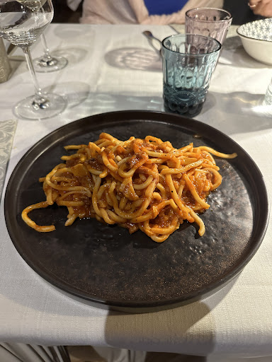 Read moreUna delle recensioni più complicate da fare...partiamo dagli antipasti, ne abbiamo presi 2, un misto affettati ed un tris di tartare, accompagnati dall'immancabile Crescia di Gubbio. Per quanto riguarda gli affettati sono di ottima qualità ma, a mio modesto avviso, mancava quella parte di formaggio che ci si aspetta in un tagliere. Le tartare buonissime, carme ottima, accompagnate da 3 salse, un pesto classico, il migliore dei 3, una crema di topinambur, abbastanza insipida, ed una crema di pomodori confit, buona anche questa ma non eccezionale. Poi abbiamo preso e primi, una pasta al pomodoro semplice, dei ravioli ripieni di carne chianina con condimento al tartufo e grattata di tartufo fresco e degli gnocchi neri al carbone con condimento di ragù bianco. In ordine, la pasta al pomodoro mio figlio ha detto che era buona, per i ravioli sono rimasto soddisfatto, gustosi e cremosi con quel tocco di tartufo che amplifica il sapore, forse un po' duri nel bordo ma, probabilmente, dipende dalla pasta all'uovo. Discorso a parte gli gnocchi, non sono come ci si aspettano gli gnocchi classici, duri, un po' gommosi, questi sono morbidi, quasi si sciolgono in bocca, quindi, se si vogliono mangiare degli gnocchi veri, non prendere questi, meglio le tagliatelle con lo stesso ragù bianco. Di secondo solo un hamburger di chianina accompagnato da una porzione di patate al forno, veramente buone, che mio figlio ha gradito molto. Volevo dare 3 stelle ma ne do' 4 perché una stella ne vale lo staff, proprietari compresi, che sono persone veramente squisite, gentilissime e molto attente alla soddisfazione del cliente, tanto per dire, quando ho detto che a mia moglie gli gnocchi non erano piaciuti si è offerto di servire in altro primo, ovviamente senza pagarlo. Ma anche i ragazzi ai tavoli simpatici e attenti. Non mi piaceva la musica di sottofondo, anni 50/60, a mio gusto troppo old style, ma sempre gusto personale è. Purtroppo l'aria condizionata non era accesa, o se era accesa non si percepiva forse a causa delle porte aperte e con 40 gradi fuori il caldo si sentiva. Naturalmente non abbiamo preso tutto quindi la mia recensione è limitata ai piatti assaggiati, ma penso che la qualità sia espressa su tutte le portate e la spesa è adeguata al tipo di ristorante ed al posto dove si trova, le caratteristiche vie di Gubbio. Comunque un antipasto da mangiare con la Crescia ed un primo o, in alternativa, solo una seconda portata, è sufficiente per il pranzo, in 3 abbiamo speso 90 euro con un calice di rosso e 3...