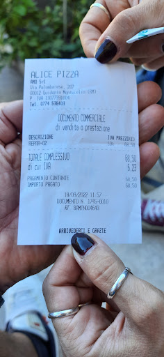 Read moreDa buon consumatore di pizza con esperienza decennale nella degustazione delle farine lavorate Alice pizza fissa uno standard medio/ alto, la scelta per me è sufficientemente ampia, impasto buono e digeribile che si abbina perfettamente alla maggior parte delle pizze esposte, ingredienti buoni e di qualità e nella giusta misura. Personalmente la margherita e un po' sottotono, non è un abbinamento al pari delle altre pizze offerte, manca secondo me una scelta adeguata alle ripiene che quando ci sono hanno un impasto troppo fine che si rompe e non trattiene la farcirura, manca la classica bianca, fritti classici come i suppli al pomodoro buoni, nella media, gli altri tipi di suppli non hanno un sapore cosi deciso da attrarre il mio palato (sembra abbiano tutti lo stesso sapore) meglio il classico. Entrare da Alice è comunque un piacere, sono organizzati e puliti. Buon appetito