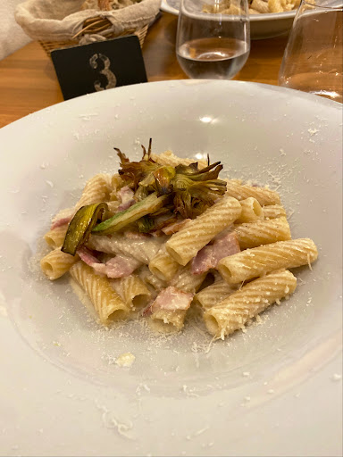Reception was lukewarm by arrogant waiter who eventually warmed up to us only after we praised his bread. Starter Fried Calamari was great but in relation to size and price at 16 Euro a rip-off. We ordered a primo to share "insieme" for which we waited ca. 30 minutes. It finally arrived on 2 plates for which we were charged twice. The meal in question, Spaghetti alle vongole con la bottarga, peperoncino e fiori di zucca was delish. It should be pointed out that the dish in question contained neither hot pepper nor courgette flowers as described on the menu. When asking the waitress for "il conto" she said yes without bothering to point out that we had to pay at...