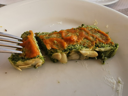 Torniamo al ristorante “Al Santuario” a Montegrazie. Questa volta siamo un numero considerevole. Due famiglie con le rispettive nonne per un totale di nove persone. Ovviamente prenotiamo e chiediamo un tavolo nella loro terrazza. La serata è calda e piacevole e la location esterna, sotto il pergolato, risulta ancor più accogliente. La struttura del menù è già impostata, a noi tocca solo…mangiare. Si parte con un Appetizer composto da una piccola bruschetta con pomodoro e patè d’olive. Piacevole. Da bere il loro Vino della casa, sia bianco che nero. Discreto. Proseguiamo con un Giro di antipasti che ci vengono serviti a rotazione e che comprendono: un primo piatto composto da tomino alla griglia, tortino di verdura, condiglione con "crumble" di pane e bresaola e poi, a seguire, una doppia melanzana con pomodoro, uno sformato di trombette e formaggio e fiori di zucca ripieni (sciue cine). Chiudiamo gli antipasti con una terrina di Insalata di farro, feta ed avocado. Antipasti, nel loro complesso, non entusiasmanti ad eccezione dell’insalatina di farro che ho trovato fresca ed originale. Passiamo al primo piatto, dei Ravioli con pesto di zucchine e basilico. Il sapore è buono, ma la cottura, a mio parere, troppo lunga. Io li avrei tolti prima, mancava la consistenza. Ed ora i due secondi. Un banalissimo Roastbeef con un contorno di Patate novelle del loro orto. Difficile per me da giudicare. Non me ne vogliano, ma questo è un piatto che, dipendesse dalla mia volontà , eliminerei da ogni tipo di menù. E per finire una terrina di Insalata di pere, sedano, noci, formaggio e ravanelli. Devo dire che hanno fatto centro anche con quest’altro tipo di insalata. Chiudiamo la serata con un Bis di dolci abbinato ad un flute di Brut: torta di mele con crumble di biscotto e pera caramellata alla cannella. Purtroppo non mi ha convinto nessuno dei due. Ci stanno ancora un paio di gelati confezionati per le pargole, quattro caffè (mediocri) ed altrettanti ammazzacaffè. Il conto prevede una quota fissa pro capite pari a 30 euro per un totale di 210 euro. Le due pargole che hanno sostanzialmente spiluccato dai nostri piatti, sono state gentilmente incluse nel prezzo. Direi una cena sotto tono rispetto agli standard a cui eravamo abituati venendo a mangiare in questo locale. Troppi piatti poco...