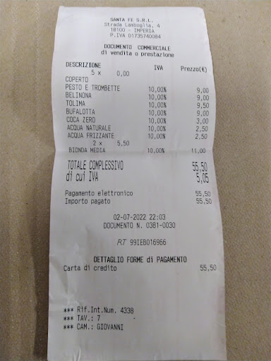 Pizza buona ma locale parecchio rumoroso e caldo ... Primo sabato sera di luglio , veloce pizzata con amici in questo locale che non provavo dall' estate scorsa . Confermo che la pizza è sempre buona ed i prezzi sono tutto sommato nella media , specialmente tenendo presente che non si paga il coperto . Nonostante l' abbondante afflusso di clienti , il servizio è stato abbastanza rapido , certo non si può parlare di cortesia quando i numerosi camerieri sono costretti a correre come matti per servire velocemente un gran numero di tavoli . Tra gli aspetti negativi ci metto il fatto che la parte interna è troppo calda nonostante l' aria condizionata . Del resto se si lasciano le finestre e le porte aperte è scontato che sia così . Poi il locale risulta molto rumoroso per il soffitto decisamente troppo basso , non si riesce quasi a parlare con il vicino di sedia senza urlare . Nel nostro caso specifico ci aggiungo i cani dei clienti che ogni tanto litigavano tra loro e persino un bambinetto che scorrazzava tra i tavoli in bici ( maleducazione dei genitori ma qualcuno poteva anche farglielo notare ... ) . Toilette in ordine ma sottodimensionata per il locale . Allego scontrino con il nostro conto in 5 ( ma con una pizza...