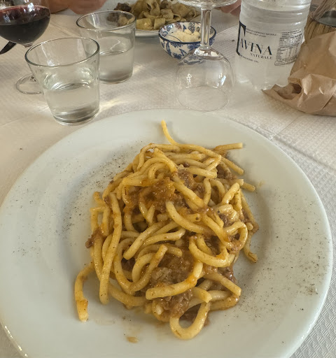 Read moreSuperlativo! Con largo anticipo prenotiamo un tavolo per festeggiare il compleanno di mio fratello, occasione perfetta per testare nuovamente questo ristorante già apprezzato qualche mese fa, in occasione di una cena di famiglia. Il locale presenta una location semplice ma accogliente, la sala non è molto ampia, i tavoli sono vicini ma per la tipologia di locale direi che non è affatto fuori luogo, anzi, sembra di essere a casa di parenti, arredo simpatico e tradizionale da trattoria, ma nello stesso tempo con cura del dettaglio. Il pranzo di oggi è stato a dir poco superlativo. Tavolozza di crostini, con sughi misti tra il classico fegatini toscani ai funghi porcini, ottima l’idea (molto gradita e apprezzata), di servire i sughi suddivisi in diverse ciotoline di ceramica e pane arrostito a parte, questo per evitare di sprecare pane e condimento ma dando la possibilità ad ognuno di mettere quantità e tipo a gradimento. Pici al cinghiale e pappardelle alla lepre (piatto del giorno), senza paragoni. Pappardelle fatte in casa (si vede e si sente), davvero buone, sughi equilibrati, per nulla unti e conditi perfettamente. Cotolette di agnello (alla griglia) e daino al tegame (piatto del giorno) accompagnati da patate arrosto, spinaci e carciofi fritti. Pur impegnandomi non riesco a trovare note negative, qualità ottima della carne, daino sublime, cotto e condito alla perfezione, e cotolette di agnello veramente speciali. I contorni hanno completato un pranzo direi perfetto e unico. Vino della casa, di un’ottima azienda vinicola delle vicinanze, e torta di mele, fatta in casa, servita tiepida e senza paragoni. La torta di di mele più buona mangiata fino ad ora. Non ci sono molte parole oltre a tanti complimenti per questo locale che merita assolutamente tutti i nostri elogi. Anche il servizio, considerato l’orario di punta e l’affollamento del locale, è stato sempre attento e discreto. Torneremo, presto. La prima volta mi ha stupito, la seconda volta mi ha letteralmente conquistato. Piatto abbondanti, prezzo onestissimi in rapporto alla qualità offerta, proprietari gentili e disponibili. Una certezza. Da fissare nel calendario come tappa...