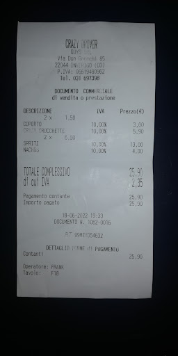 Read moreCi siamo fermati una sera per un aperitivo, ci accoglie una cortese cameriera che comunica che insieme al cocktail loro non servono stuzzichini, ma dobbiamo scegliere noi cosa farci portare. Si mette davanti al tavolo e non abbiamo quasi il tempo di consultare con calma il menù. Scegliamo dei Nachos e delle Crazy crocchette. Arriva uno spritz completamente annacquato, con un sospetto di Campari oltre a generoso ghiaccio e poi 4 pezzetti minuscoli di crocchette ed una ciotolina di Nachos. Arrivati alla cassa paghiamo ben 25.90. A casa controlliamo lo scontrino e confrontiamo con il menù pubblicato sul loro sito. Ebbene si, anche per un aperitivo fanno pagare il coperto (mai accaduto da nessuna parte) e scopriamo che le invisibili crocchette dovevano essere 8 pezzi e non 4. Colpa nostra che non abbiamo letto bene, del resto cosa abbastanza difficile con la tizia che continuava a parlare ed a indicarci piatti su piatti mandandoci in...