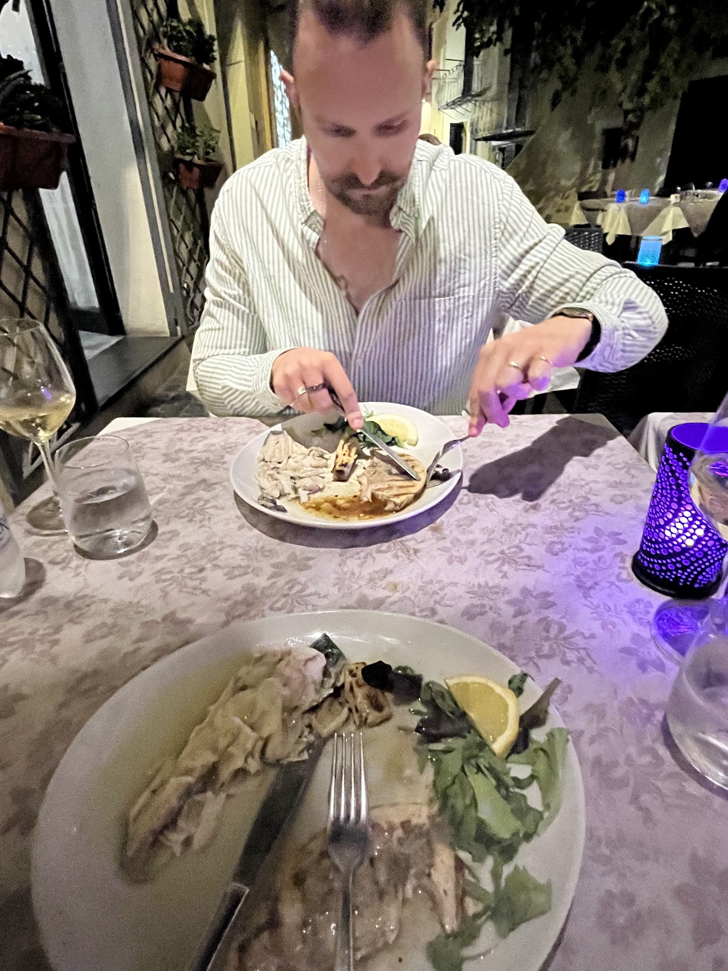 The waiters/owner were very friendly and charming. We got spaghetti with shrimp which was pretty good. We also got fresh grilled Dorada which is a local fish. This was ok in comparison to others weâve had.
