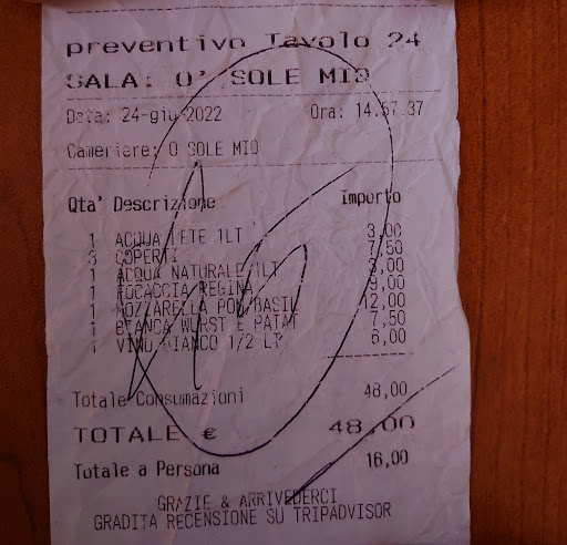 Disonestà travestita da cortesia… Festa di Sant’Anna, in tre alla ricerca di un tavolo per cena prima dei fuochi. Attratte dalla location proviamo a chiedere posto, ed un cameriere affabile promette il miracolo, cena vista castello in una mezz’oretta di attesa… Ed effettivamente mantiene la parola, si affretta risoluto a farci preparare un tavolo fuori, e noi entusiaste ringraziamo pronte a goderci la cena. Stiamo per sederci ed il cameriere avverte “voi sapete del menù fisso no?”..ma del menù fisso neanche l’ombra, nulla di scritto. Ad ogni modo lo attendiamo per farci spiegare e decidere sulle ordinazioni e ci comunica chiaramente che il costo a persona è di 60 euro, e comprende antipasto e primo/secondo mare o terra. Alche chiediamo se sia possibile comunque ordinare il primo o il secondo a nostra scelta, dunque sostiture quello previsto nel menu fisso con una nostra preferenza, e con molta gentilezza e simpatia, ci risponde di sì, certamente… Peccato che la sua cortesia e battute conviviali siano state la maschera della sua disonestà! Ha approfittato del nostro desiderio di cenare nella location per ammirare i fuochi, e nell’equicoco portarci crudi di mare come inclusi in menu fisso… Peccato che alla resa del conto…o meglio dei conti, il responsabile cassa ci abbia comunicato un costo nettamente differente da quello prospettato. Allo spiegargli l’accaduto ci viene risposto che siamo noi in errore, non avendo compreso che sarebbe stato ad ogni modo impossibile avere un antipasto di crudo in un menu di 60 euro. Non solo, il cameriere non si è scusato dichiarando anche il falso, ovvero di averci detto che se volevamo potevamo ordinare alla carta. Non un cenno di comprensione e attenzione sul conto finale. Caro new management de ‘O sole mio’, più che “sole” forse dovreste cambiare anche il nome in “sola”..una settimana fa veniva segnalata la stessa presenza furbesca tra i tavoli nelle ultime recensioni disponibili…. ma prendi oggi 30 euro in più a cliente con disonestà, prendi domani 2-3 recensioni pessime per la stessa motivazione, il locale diventerà presto meta esclusivamente per turisti che ahimè, come noi questa sera, non troveranno posto da nessuna altra parte. E soprattutto non avranno letto le ultime recensioni. Sconsiglio l’esperienza soprattutto per il trattamento finale privo di professionalità e cura...