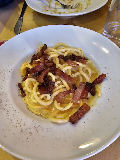 Read moreAndato una sera a cena con degli amici,posto che si trova in un luogo abbastanza affollato e bello,al centro di Isola liri quasi vicino la cascata; Fuori si vede che è un locale di piccole dimensioni,carino e ben fatto. All'entrata del locale si viene accolti da un ragazzo(penso sia il proprietario) che con aria gentile ci ha fatto accomodare e ci ha subito portato i menù. Ordino una carbonara per primo,veramente molto buona,non per esagerare ma penso una delle più buone che io abbia mai mangiato;leggera,gustosa e un bel bilanciamento di pepe e uova,guanciale di alta qualità, per secondo prendo una entrecote di bufala,molto tenera e gustosa,impiattamento carino con delle cipolle rosse caramellate e una salsa di peperone; contorno di patate e da bere acqua,cocacola e vino. Per dolce ci ha consigliato il tiramisù fatto da loro al pistacchio, da non perdere!!! Nel complesso posso dire che io ci tornerò volentieri,un locale tranquillo,buono e alla mano,con prezzi nella norma,personale educato,forse l'unica pecca è il servizio un po' lentino,ma stando con amici non guardo all'orologio. Mi complimento con il proprietario per il locale,4 stelle...