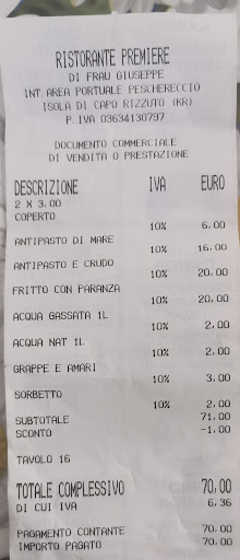 Read moreSiamo venuti la sera di ferragosto. Eravamo scettici visto alcune recensioni che ci avevano lasciato un po' interdetti. Non avendo alternative siamo andati lo stesso. Siamo rimasti piacevolmente sorpresi dal fatto che non abbiamo riscontrato nulla di quello che è stato scritto, il che ci ha fatto dubitare sulla veridicità di certe affermazioni. Quindi diffidate perché abbiamo mangiato benissimo. Pesce freschissimo e cucinato a puntino. Io ho preso un trancio di spada davvero squisito. Ma la specialità è stato il primo con il pescato del giorno che ha preso mio marito: scorfano e rana pescatrice. Servizio veloce e cameriere molto gentili. Il fatto che nel menu non ci siano così tante proposte e, soprattutto, che non ci siano alternative di carne è sintomo di autenticità che preserva la qualità della materia prima. È stata la nostra cena conclusiva delle vacanze e non ci ha deluso affatto! Provare...