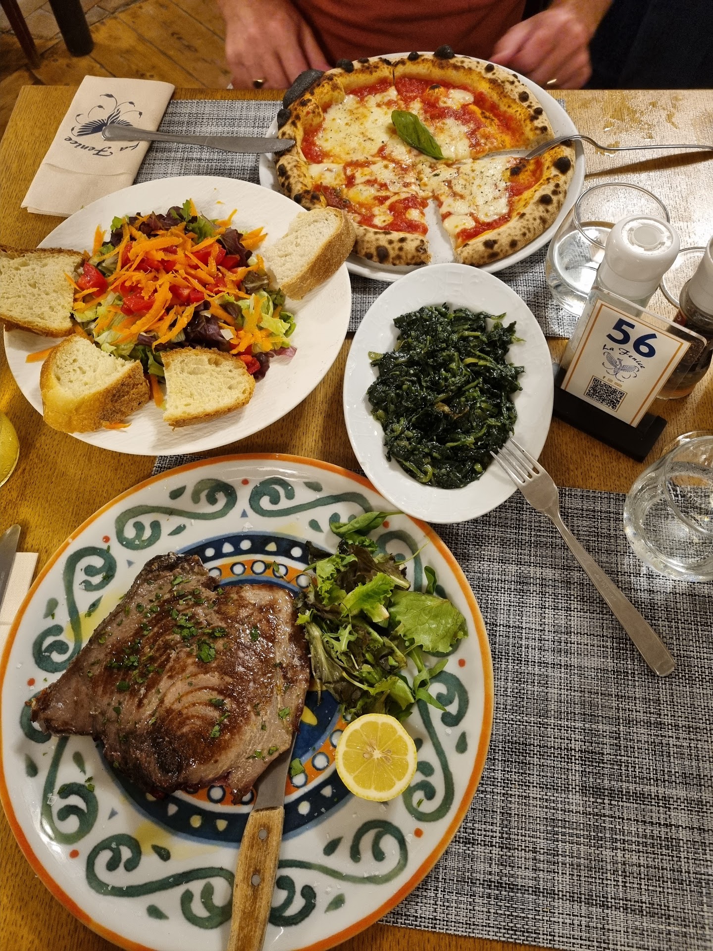 La prima sera abbiamo optato per il menù turistico, che offre antipasto, primo, secondo, acqua e vino a 30€. L’antipasto (crostino di mare) e il primo (orecchiette ai frutti di mare) erano buoni e abbondanti. Arrivati al secondo (sgombro alla griglia) purtroppo abbiamo avuto un problemino, che può capitare, in quanto il pesce era poco cotto all’interno. Il cameriere stesso si è accorto di questo fatto passando per i tavoli e vedendo che il pesce era pressoché intatto all’interno del piatto, dopo che era stato aperto a metà. Avendo una parte visibilmente poco cotta (tendente al crudo) ho preferito non mangiarlo. Il cameriere sei è scusato e ha proposto di portarmi un altro piatto ma in quel momento, visto l’accaduto, non avevo più appetito e comunque il piatto offerto non era di mio gradimento. Ho rifiutato e ho comunque avvisato il cameriere che saremo tornati qualche sera dopo per la pizza, e scherzando ho detto che ci saremmo regolati in qualche modo, se non la sera stessa la sera dopo.