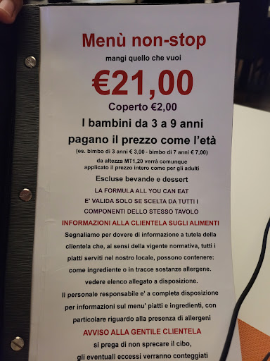 Locale molto tranquillo e riservato, provato a pranzo,c'erano pochissimi clienti,il menù è abbastanza ampio ma povero di foto,alcuni piatti si ordinano non sapendo cosa arriva,le porzioni sono molto piccole,il servizio è scorrevole,il personale è molto cortese ma troppo frettoloso di portare via i piatti,nemmeno il tempo di mangiare l'ultimo boccone e già arriva il cameriere,tutto sommato si mangia bene,la qualità del cibo è discreta. Abbiamo patito il caldo perché nonostante ci fosse l'aria condizionata,o non era accesa o non funzionava. Situato sulla strada non ha moltissimo parcheggio,il locale è abbastanza pulito,ristrutturato non molto tempo fa,tranne il bagno che,oltre ad essere molto minimal,sembra non essere stato rinnovato(mancava anche la tavoletta del wc!). Tornerò per il menù serale per valutare la differenza. Provato anche a cena, aria condizionata spenta, aria irrespirabile con 30 gradi di agosto, il menù è lo stesso di mezzogiorno, l'unico piatto in più sono i gamberoni alla piastra(ecco la differenza di 5 euro tra pranzo e cena), i tempi di attesa tra una portata e l'altra sono stati molto lunghi,dopo un'ora e metà cena abbiamo ordinato il caffè perché si moriva di caldo,arrivata alla cassa per pagare hanno acceso l'aria condizionata. Abbiamo pagato 44 euro in 2 e siamo usciti ancora affamati perché comunque,ribadisco,che le porzioni sono veramente piccole. Si può fare a mezzogiorno,la sera lo sconsiglio,negli altri all you can eat alla sera c'è un menù...