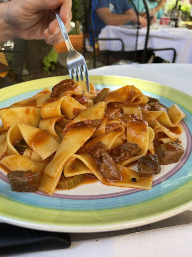 Read moreItri profuma di tradizione. Merito di trattorie come questa, che con un menù semplice, declinato all'essenziale, consente di assaggiare l'autentica cucina locale. Di tradizione contadina, anche se con sughi forse troppo lunghi che poco si conciliano con la stagione calda, Murat offre proposte interessanti. Come le pappardelle al ragù di cinghiale, una pietanza che non è possibile assaporare ovunque e che, dunque, fa dimenticare i trentacinque gradi ad ora di pranzo. Pasta fresca tirata alla perfezione e carni genuine, il tutto servito ai tavoli all’esterno, all’ombra delle verdi chiome degli alberi sulla strada e del rinfrescante scroscio della vicina fontana.