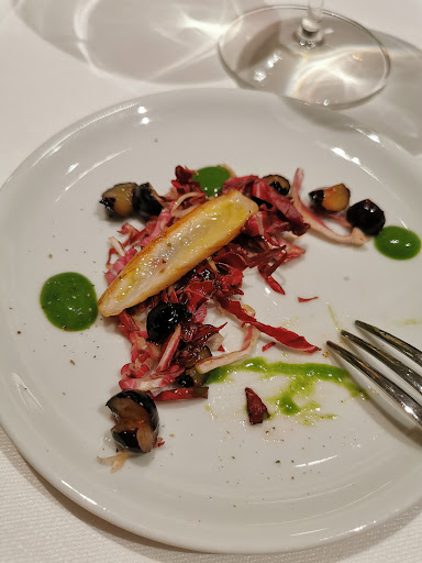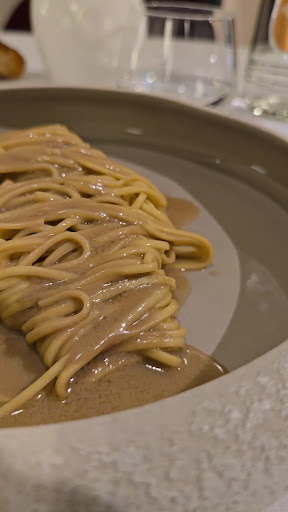 Contro: -Il pavimento della sala traballa leggermente ad ogni passo, i camerieri "corrono" un po' troppo e spesso si scontrano creando a volte un clima un po' caotico. A volte sembra di mangiare in un palco dal quale non si sa bene da che parte debbano uscire gli attori e si crea questo fuggi fuggi dove si scontrano. -i piatti delle entreè erano pieni di ditate sulla "tesa del cappellino" -la grattugiatura del tartufo è stata un po' incerta e il risultato un po' meh, non centrando il piatto e consistendo piú di frammenti che di scaglie. Forse è da rivedere la grattugia o forse il servizio è da perfezionare.