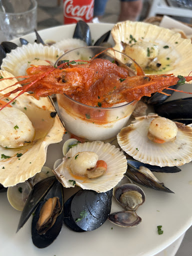 Nous avons débuté le repas avec : Salade de fruits de mer (qui est plus une assiette de crustacés) et moules en sauce tomate. Ce début était bon. Pour moi manquait un peu d'assaisonnement et du poivré avec les moules. Pour la suite un plat pour deux de fritto misto bien fait car peu gras. Plats à suivre avec des Scampi tendres et grillés à la perfection et spaghetti alle vongole. Cette dernière assiette, si elle a satisfait mes attentes avec une cuisson al dente et des vongoles bien cuites, méritait quelques tomates cerises et un assaisonnement plus attentif avec les crustacés (mais c'est une appréciation de goût). Les plats sont copieux et cela fait plaisir. Un petit litre de vin de la maison a été parfait pour accompagner notre repas. Café et digestifs offerts ce qui est toujours plaisant. L'accueil et le service sont agréables.