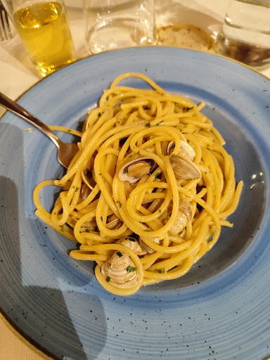 For the first time in Italy, I left a restaurant not satisfied. Very unfriendly waiter. He throws the menu on the table. The waiter does everything to leave your table as quickly as possible. My wife ordered Gnocchi al Capriccio, it was delicious, but the portion was very small. I ordered the Spaghetti Alle Vongole. It was terrible. It is simply not tasty, and by the time you clean the clams (they use the smallest ones), your pasta will already be cold. A service fee of €5 was written into the check without warning. It doesn't seem like much, but for such quality of food and service, it's not worthy. We will never come...