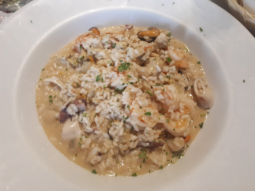 Direkt an der Straße gelegen beansprucht das Restaurant auch den Bürgersteig und hat dort Tische aufgestellt. Das ist für die Passanten bestimmt störend, da sie die Radfahrerspur betreten müssen, aber gut für die zahlreichen Restauranetbesucher. Der Service ist absolut freundlich, alle Mitarbeiter sind sehr aufmerksam und der Chef läuft überall rum und kontrolliert, ob es vernünftig läuft. Das Risotto, das für mindestens zwei Personen bestellt werden muss, ist einfach sensationell, vielleicht eine Spur zu salzig. Ein Scampi komplett, dazu reichlich Krabben, Miesmuscheln (ausgelöst), Tintenfisch und kleine Kammmuscheln. Die Wartezeit beträgt ca 20 Minuten, das Risotto wird stets frisch zubereitet!