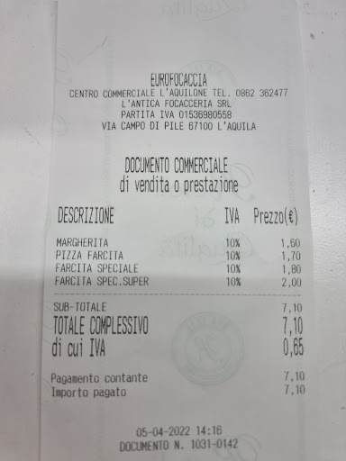 Read moreCliente fedelissima a eurofocaccia che si trova presso il centro commerciale l'aquilone fino ad oggi. Vado a prendere dei pezzi di pizza da portare via, comincio dalla Margherita... La ragazza bionda taglia il pezzo centrale lo toglie e mi dà l'angolo. Le dico se per favore mi può lasciare la parte centrale e lei mi dice che hanno un regolamento per cui ogni tre pezzi centrali sono obbligati a dare la parte dell'angolo. Proseguo con un pezzo di pizza rossa sempre per mio figlio e mi dice che anche di quella era costretta a darmi l'angolo. Le dico di mettere tutto a posto senza prendere nulla. E non ci prenderò più nulla. Una cosa non mi spiego... Nella teglia di Margherita c'erano due pezzi centrali e due angoli... Se la matematica non è un'opinione qualcosa non mi torna....