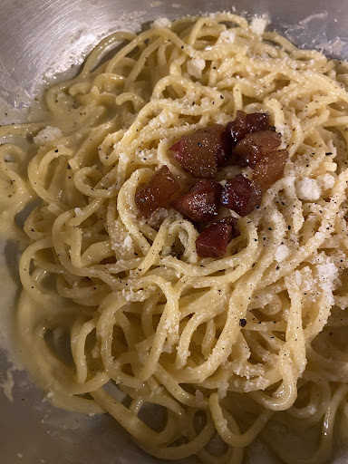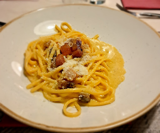 Read moreSiamo stati in questo ristorante a cena. Il locale è molto carino, con una bella atmosfera (devo dire che rende più dal vivo che in foto). Il personale è tutto gentile, educato, presente e rapido, abbiamo lasciato volentieri una mancia. Abbiamo preso due primi, due secondi, una bottiglia di vino, una d’acqua e due dolci (conto totale 84€). Commento rapido sui primi: T R O P P O B U O N I I I I ! ! ! Io non sono amante della pasta, ma ho letto che viene fatta a mano e non potevo non prenderla. Ho scelto l’amatriciana con una sorta di spaghettoni alla chitarra (non ricordo il nome) ignorantissimi, la pasta buona, callosa, cotta perfettamente, il sugo COMMOVENTE per quanto era perfetto: dolce, cotto bene, il guanciale altrettanto perfetto, non era per niente salato (cosa non scontata). Insomma, mi sono proprio scialata e mi sono calata quel bel padellone di amatriciana felice come una Pasqua. Il mio compagno ha preso le tagliatelle al sugo di cinghiale. E qui, altra standing ovation alla cucina perché per la prima volta (sì, la PRIMA volta), finalmente troviamo un sugo di cinghiale con la carne morbida, non stoppacciosa e gustosa senza essere piena di sale. E pure quella è scesa giù che è una bellezza. Secondi: consigliatissime le costolette panate di agnello (pure qui, in teoria non mi piace neanche l’agnello, ma una costoletta me la sono tirata giù con molta gioia) e il filetto di maiale con asparagi, cipolle caramellate e un pochino di purè. Oh, indovinate? Buono tutto! Cottura filetto perfetta, rosa dentro, umido il giusto, purè buonissimo, avrei forse messo qualche cipolla caramellata in più. Dolci: tiramisù e torta alle pere. Il tiramisù si sentiva che era fatto in casa ed era buono, la crema al mascarpone senza panna come vuole la legge. Migliorerei invece la torta pere e ricotta: mi permetto di consigliare qualche fettina di pera, mantenere le scaglie di cioccolato ed una spolverata di zucchero a velo e togliere la panna ed il topping. Consiglio anche di provare gli antipasti fritti perché sicuramente meritano, noi essendoci buttati su due primi e due secondi abbiamo dovuto evitare l’antipasto. La pizza bianca che ci hanno portato avrebbe avuto bisogno di una leggera riscaldata. La prossima volta che torniamo voglio...