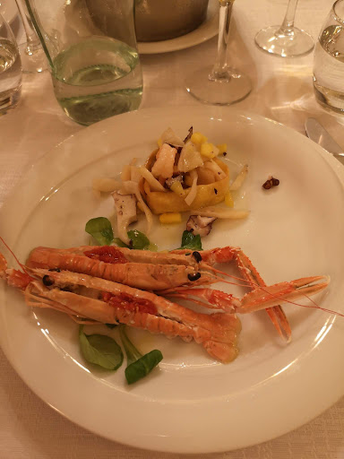 Abbiamo iniziato con antipasti di pesce sia crudi che cotti, sia freddi che caldi,, davvero tantissimi e curati nei dettagli. La qualità del cibo è altissima, con pesce freschissimo e proposte varie, alcune anche originali e sorprendenti: accostamenti con agrumi o tartufo, fino all'“ostrica ubriaca” con il gin, che regala un’esplosione di sapori inaspettata e deliziosa. Anche i primi e i dolci sono stati all’altezza: ben presentati, gustosi e creativi.