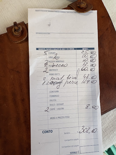 Nel nostro scontrino da oltre 800euro veniva dichiarato che avevamo mangiato 3 kg di rombo in 5 persone quindi, secondo il ristoratore, ognuno di noi avrebbe mangiato ben 600grammi a testa di rombo quando nel piatto, a stento, ce n'era meno di 50grammi. Altra assurdità è stato pagare quasi 45 euro un singolo piatto di spaghetti all'astice.
