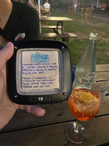 We were recently staying in the village so stopped off here for dinner one evening. We loved the atmosphere and sat outside to eat. Prices of food and drink are great and the food was to die for! The menu was in Italian and English which was great and the man taking orders spoke good English too đ You have to queue to order which normally wouldnât be a problem but the evening we visited there was a large party of teenagers in the garden and they seemed to have their drinks on a tab so whilst other customers queued up, teenagers would just come in and go straight to the front to order more cocktails, which were extremely time consuming so we stood there queuing for what felt like forever whilst they just came and went and had their drinks made instantly. Again this was annoying but I would have felt valued as a customer if the staff acknowledged other customers and apologised for the wait but he didnât. Unfortunately there was only one man taking orders and making cocktails, another member of staff on the till would have sped everything up especially if you have a large party in? Despite the wait to order the rest of the experience was great,...